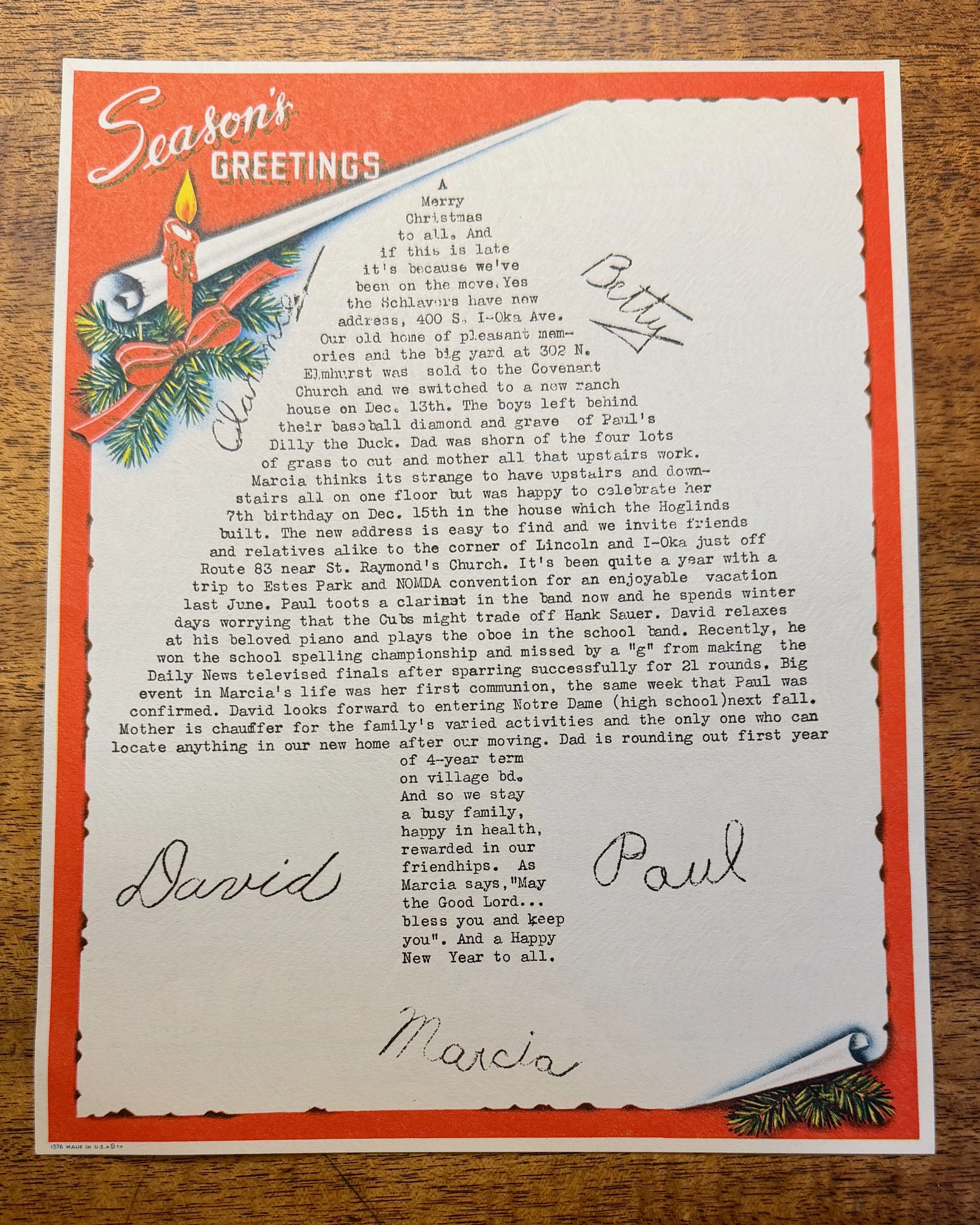 A Merry Christmas to all. And if this is late it's because we've been on the move. Yes the Schlavers have new address, 400 S. I-Oka Ave. Our old home of pleasant memories and the big yard at 302 N. Elmhurst was sold to the Covenant Church and we switched to a new ranch house on Dec. 13th. The boys left behind their baseball diamond and grave of Paul's Dilly the Duck. Dad was shorn of the four lots of grass to cut and mother all that upstairs work. Marcia thinks its strange to have upstairs and downstairs all on one floor but was happy to celebrate her 7th birthday on Dec. 15th in the house which the Hoglinds built. The new address is easy to find and we invite friends and relatives alike to the corner of Lincoln and I-Oka just off Route 83 near St. Raymond's Church. It's been quite a year with a trip to Estes Park and NOMDA convention for an enjoyable vacation last June. Paul toots a clarinet in the band now and he spends winter days worrying that the Cubs might trade off Hank Sauer. David relaxes at his beloved piano and plays the oboe in the school band. Recently, he won the school spelling championship and missed by a "g" from making the Daily News televised finals after sparring successfully for 21 rounds. Big event in Marcia's life was her first communion, the same week that Paul was confirmed. David looks forward to entering Notre Dame (high school) next fall. Mother is chauffer for the family's varied activities and the only one who can locate anything in our new home after our moving. Dad is rounding out first year of 4-year term on village bd. And so we stay a busy family, happy in health, rewarded in our friendships. As Marcia says, "May the Good Lord... bless you and keep you". And a Happy New Year to all.