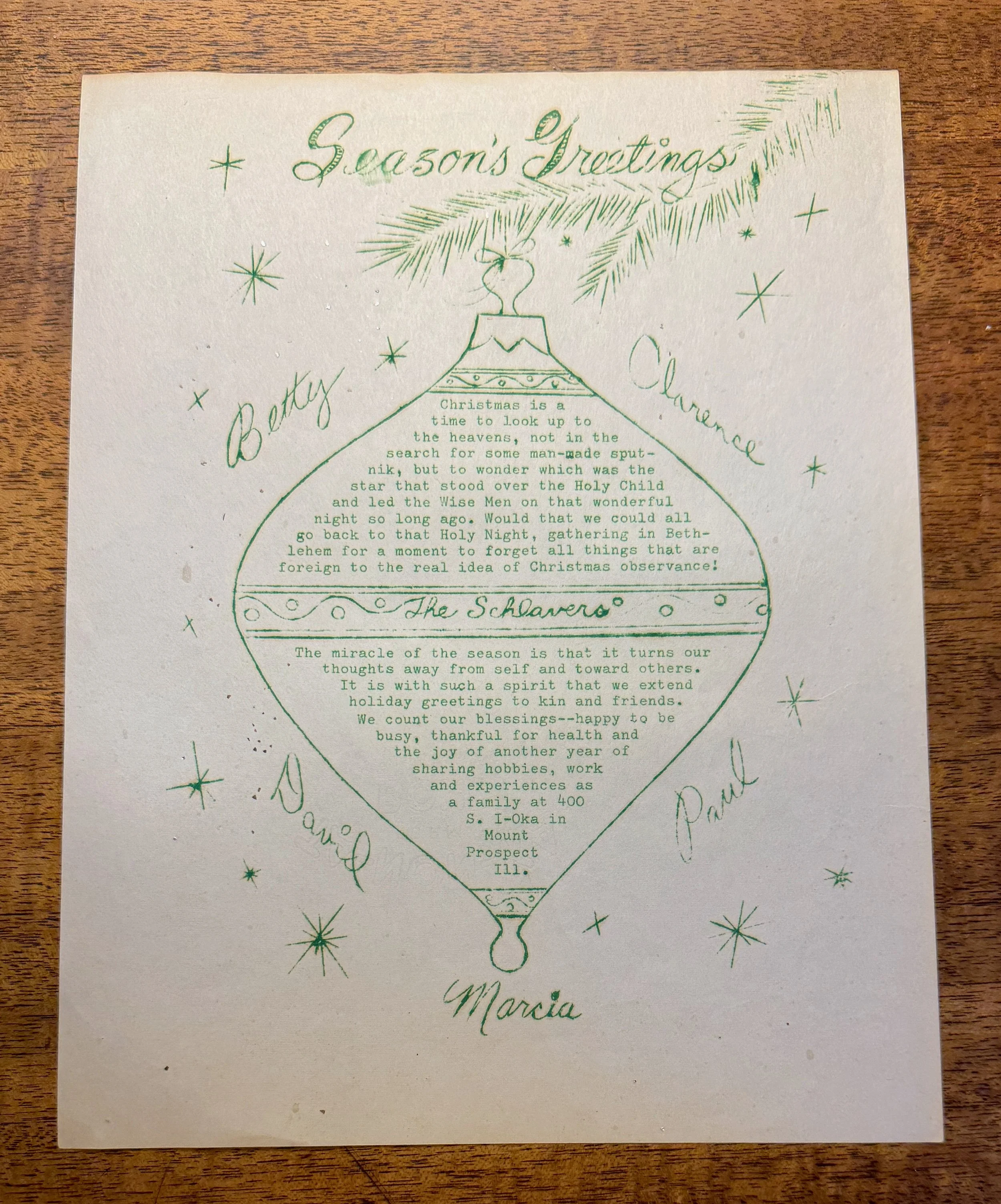 The miracle of the season is that it turns our thoughts away from self and toward others. It is with such a spirit that we extend holiday greetings to kin and friends. We count our blessings--happy to be busy, thankful for health and the joy of another year of sharing hobbies, work and experiences as a family at 400 S. I-Oka in Mount Prospect Ill.