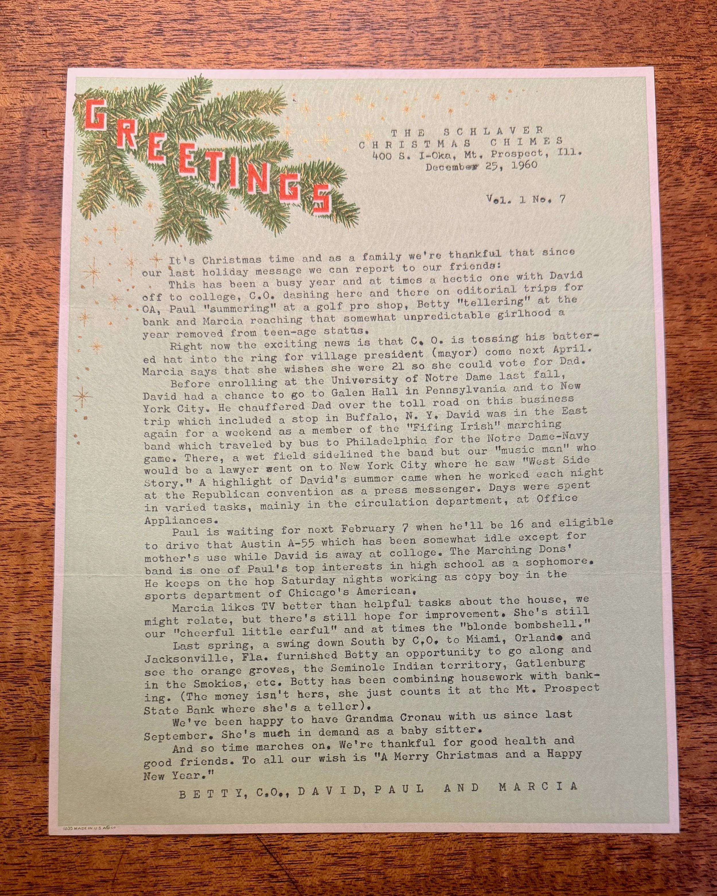 Vol. 1 No. 7 of "The Schlaver Christmas Chimes," dated December 25, 1960.
