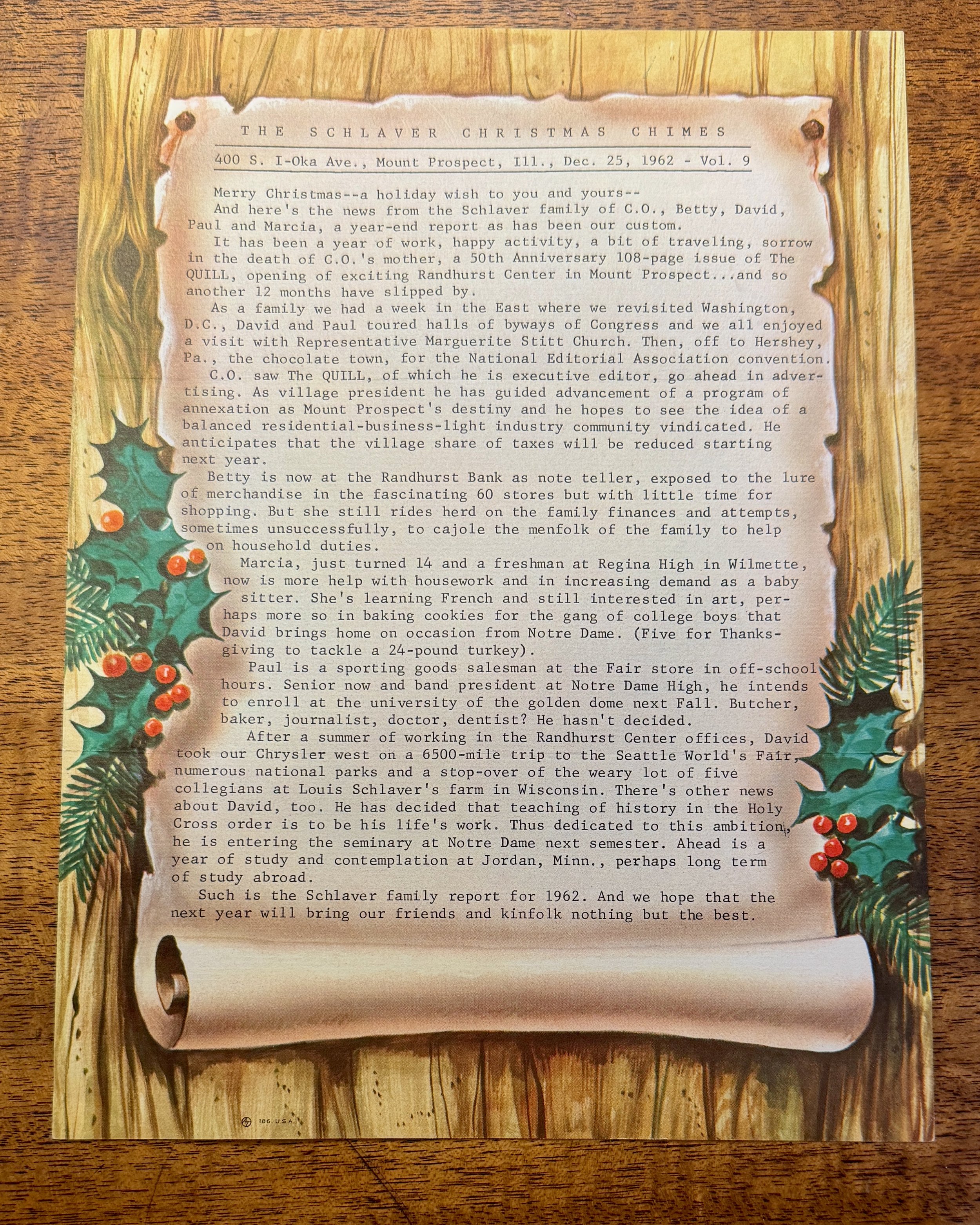 Merry Christmas--a holiday wish to you and yours-- And here's the news from the Schlaver family of C.O., Betty, David, Paul and Marcia, a year-end report as has been our custom. It has been a year of work, happy activity, a bit of traveling, sorrow in the death of C.O.'s mother, a 50th Anniversary 108-page issue of THE QUILL, opening of exciting Randhurst Center in Mount Prospect...and so another 12 months have slipped by.