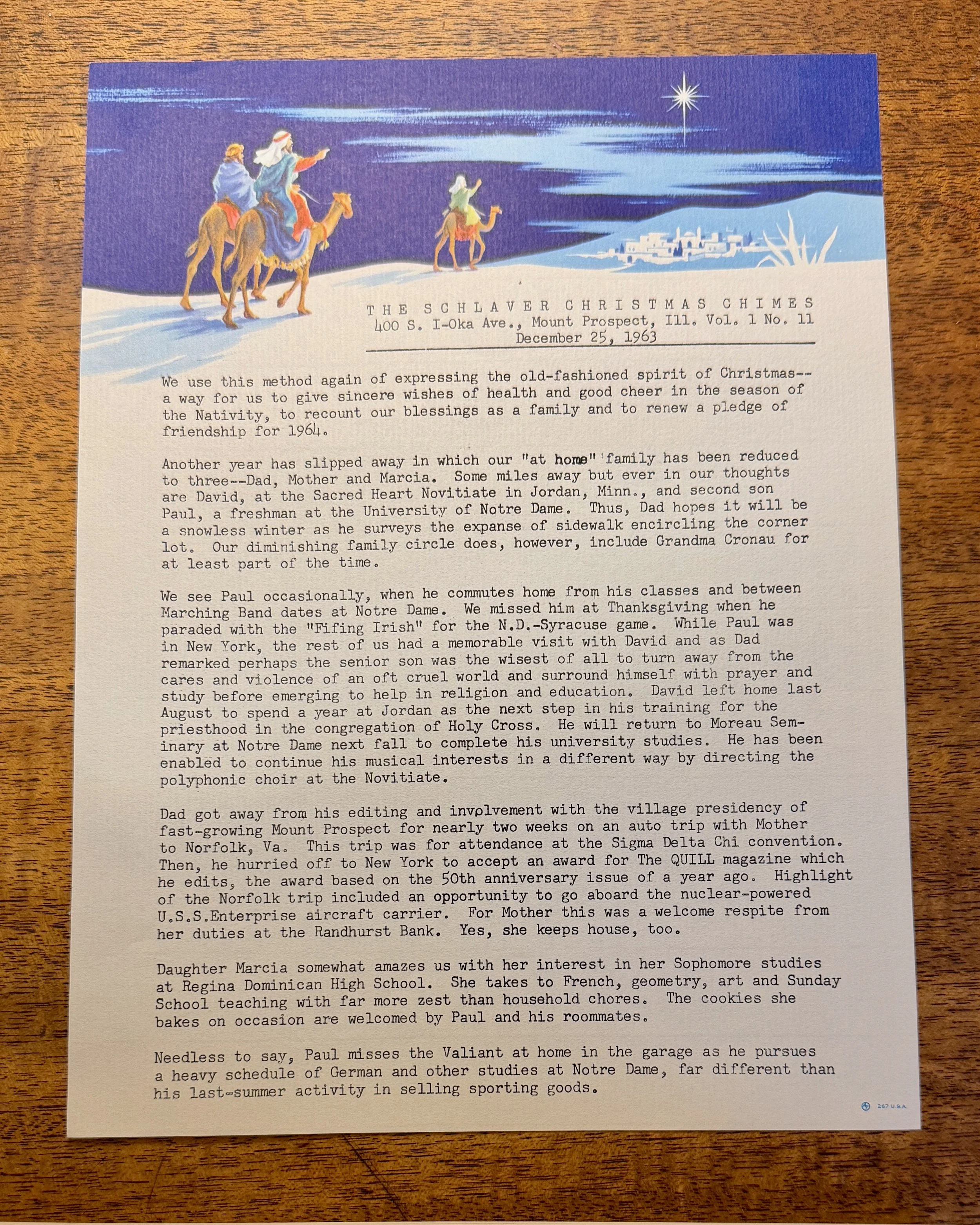 We use this method again of expressing the old-fashioned spirit of Christmas--a way for us to give sincere wishes of health and good cheer in the season of the Nativity, to recount our blessings as a family and to renew a pledge of friendship for 1964.