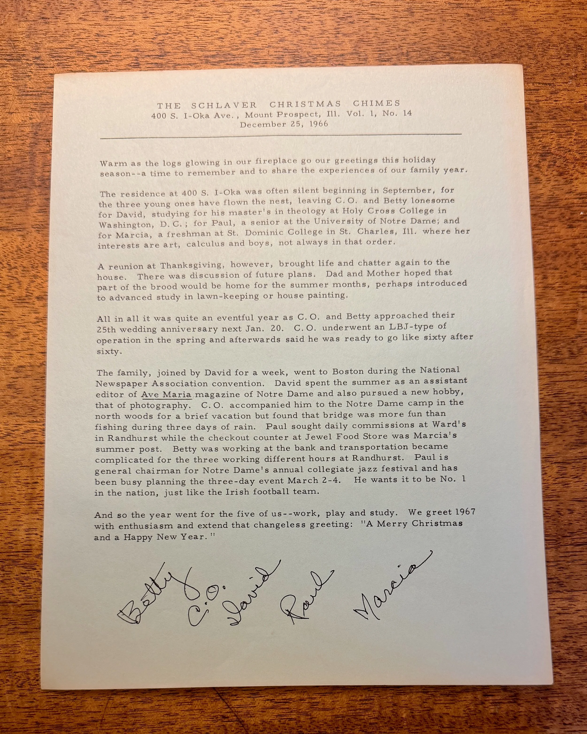 The family, joined by David for a week, went to Boston during the National Newspaper Association convention. David spent the summer as an assistant editor of Ave Maria magazine of Notre Dame and also pursued a new hobby, that of photography. C. O. accompanied him to the Notre Dame camp in the north woods for a brief vacation but found that bridge was more fun than fishing during three days of rain. Paul sought daily commissions at Ward's in Randhurst while the checkout counter at Jewel Food Store was Marcia's summer post. Betty was working at the bank and transportation became complicated for the three working different hours at Randhurst. Paul is general chairman for Notre Dame's annual collegiate jazz festival and has been busy planning the three-day event March 2-4. He wants it to be No. 1 in the nation, just like the Irish football team.
