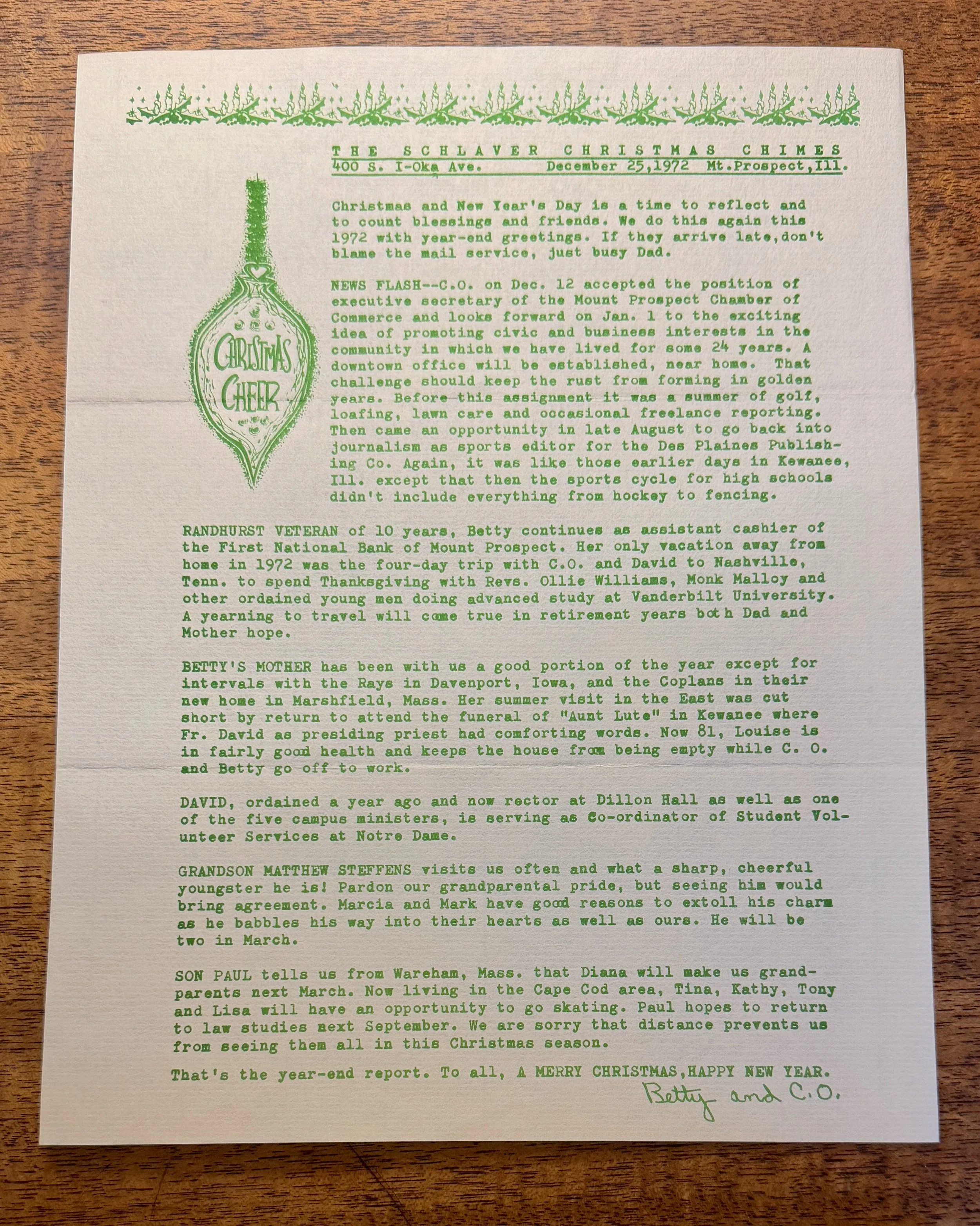 THE SCHLAVER CHRISTMAS CHIMES — December 25, 1972