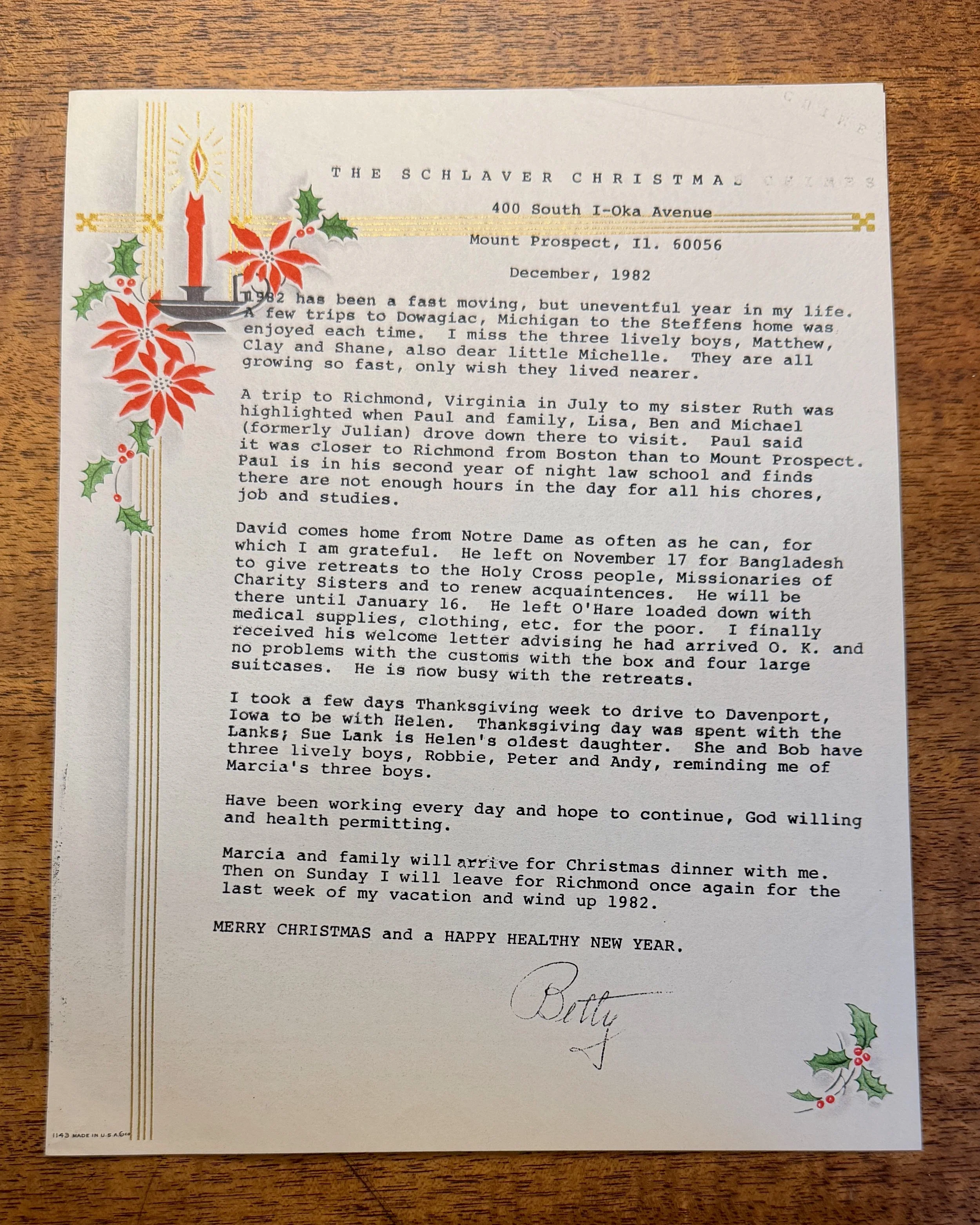 David comes home from Notre Dame as often as he can, for which I am grateful. He left on November 17 for Bangladesh to give retreats to the Holy Cross people, Missionaries of Charity Sisters and to renew acquaintances. He will be there until January 16. He left O'Hare loaded down with medical supplies, clothing, etc. for the poor. I finally received his welcome letter advising he had arrived O.K. and no problems with the customs with the box and four large suitcases. He is now busy with the retreats.