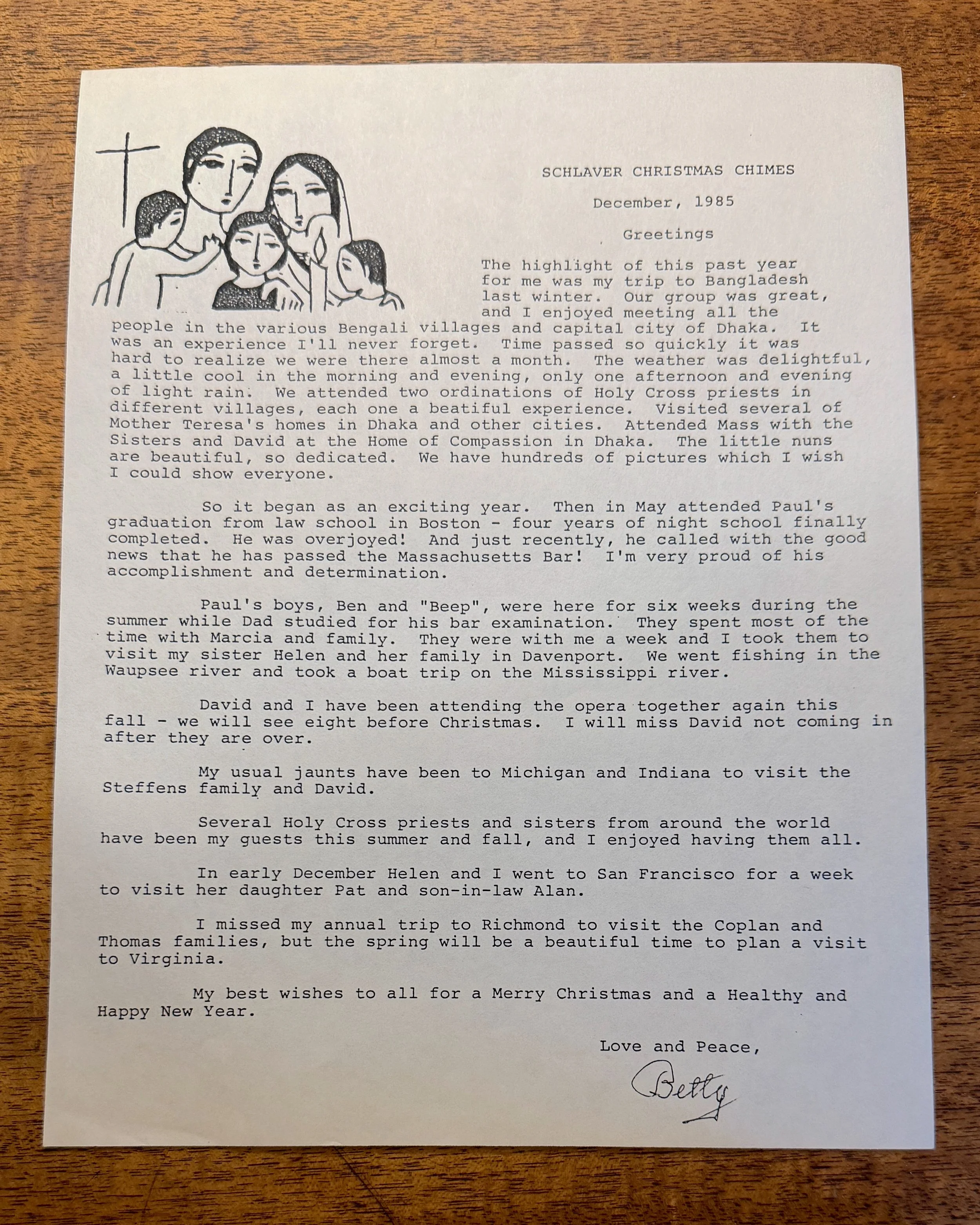 The highlight of this past year for me was my trip to Bangladesh last winter. Our group was great, and I enjoyed meeting all the people in the various Bengali villages and capital city of Dhaka. It was an experience I'll never forget. Time passed so quickly it was hard to realize we were there almost a month. The weather was delightful, a little cool in the morning and evening, only one afternoon and evening of light rain. We attended two ordinations of Holy Cross priests in different villages, each one a beautiful experience. Visited several of Mother Teresa's homes in Dhaka and other cities. Attended Mass with the Sisters and David at the Home of Compassion in Dhaka. The little nuns are beautiful, so dedicated. We have hundreds of pictures which I wish I could show everyone.