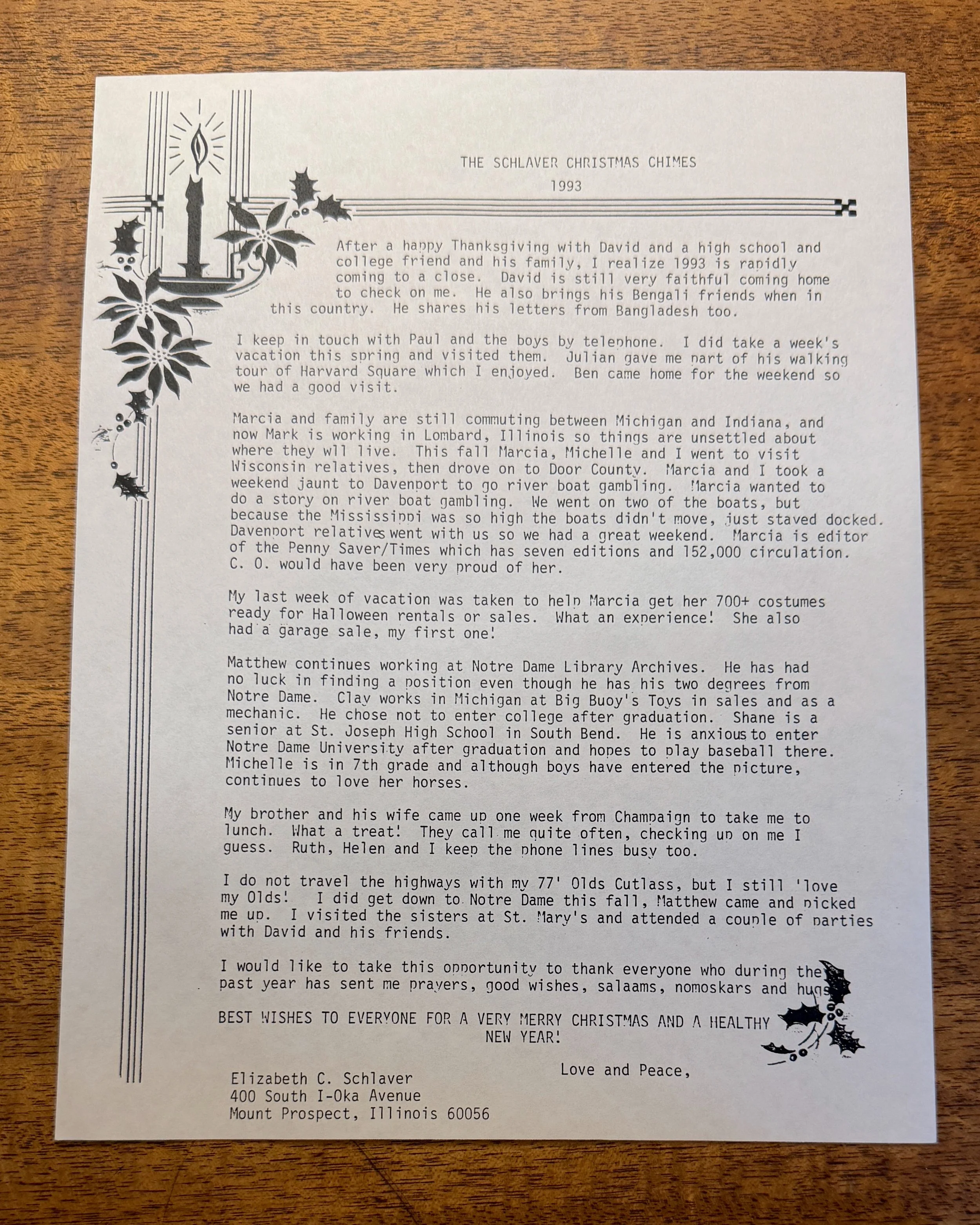 After a happy Thanksgiving with David and a high school and college friend and his family, I realize 1993 is rapidly coming to a close. David is still very faithful coming home to check on me. He also brings his Bengali friends when in this country. He shares his letters from Bangladesh too.