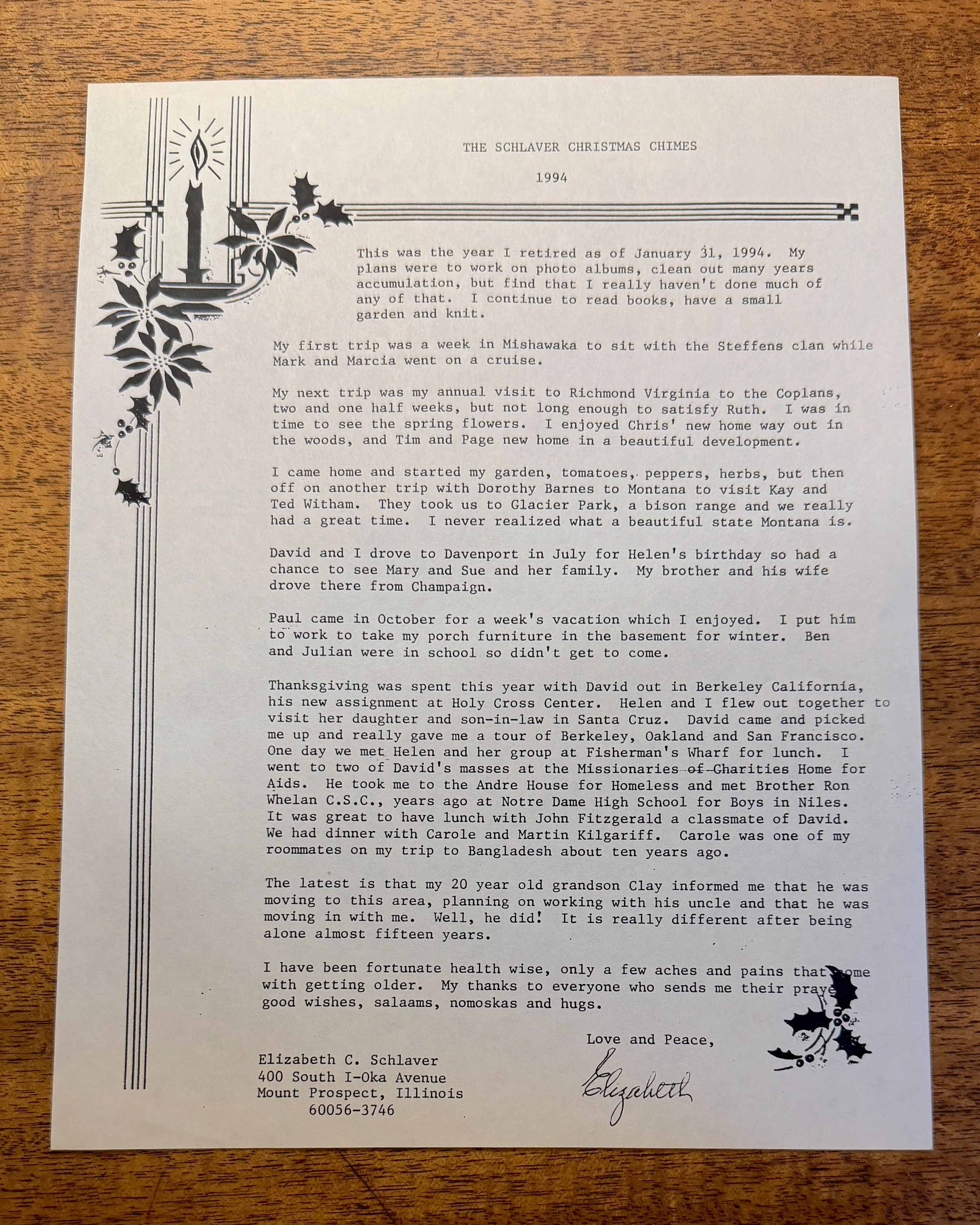 This was the year I retired as of January 31, 1994. My plans were to work on photo albums, clean out many years accumulation, but find that I really haven’t done much of any of that. I continue to read books, have a small garden and knit.